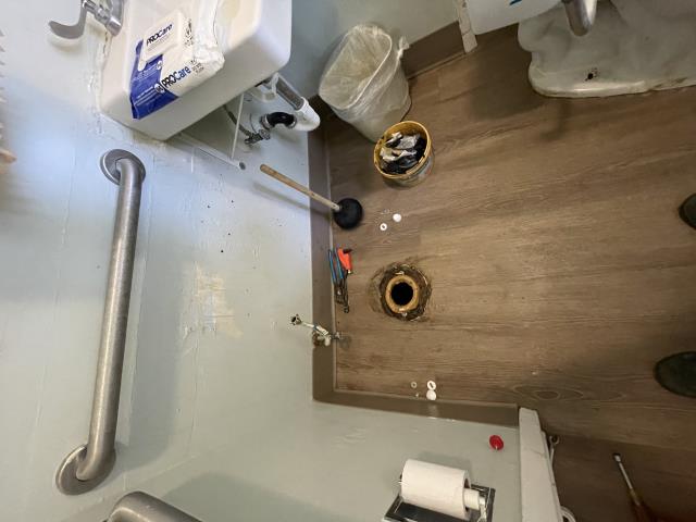 Wood floors discolored and warping by bathroom. Removed wood panel under right side bathroom sink and found abs vent broken at tee.